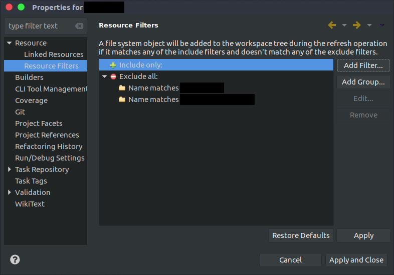 - Right-click (parent) project > Properties > Resource > Resource Filters